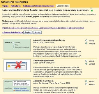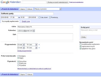 Google Kalendarz to bardzo wygodne narzędzie do zarządzania naszym czasem. Tak jak w każdym kalendarzu, możemy dodawać do niego informacje o planowanych wydarzeniach, określając datę i czas. Kalendarz w Google idzie o wiele dalej. Pozwala ustawić przypomnienie o wydarzeniu wysyłane nie tylko emailem, ale również SMS-em. Google Kalendarz wysyła je za darmo do wszystkich polskich sieci! Ustanawiając spotkanie z naszymi współpracownikami możemy wyszukać wspólny wolny czas. Do tej pory taka funkcja dostępna była tylko profesjonalnych kalendarzach desktopowych.